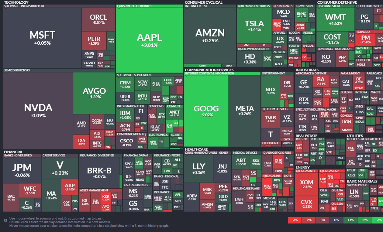 → 알파벳(GOOGL) 급등을 중심으로 메가테크가 지수를 견인.