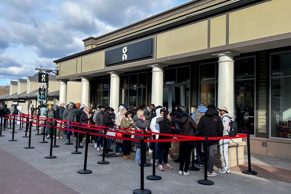 미국 뉴욕주 우드버리 센트럴 밸리에 위치한 우드버리 커먼 프리미엄 아울렛에서 추수감사절 이후 쇼핑 열풍이 불면서 수많은 할인품 사냥꾼들이 매장으로 몰려드는 블랙 프라이데이 세일 기간 동안 온 스니커즈 매장 밖에 사람들이 줄을 서 있다 (출처=연합뉴스) |