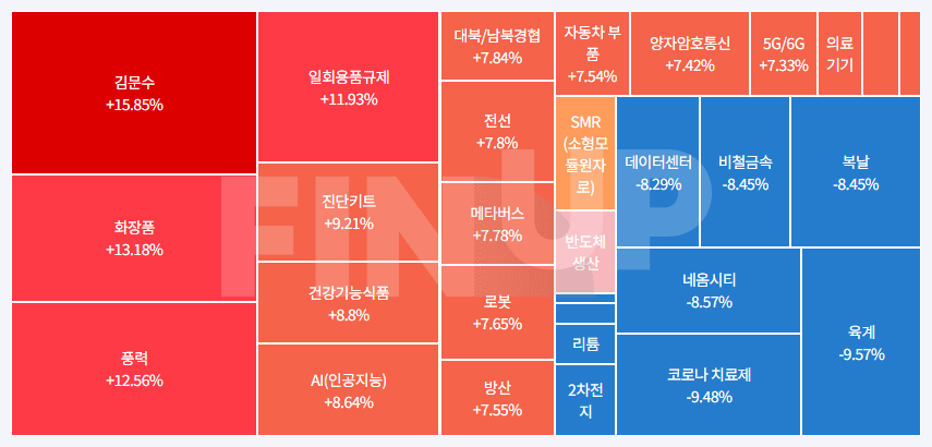 에너지 강세: 두산에너빌리티 +7.51%(52주 최고가), LS ELECTRIC +8.14%, 가온전선 +11.42%, HD현대일렉트릭 +7.42%