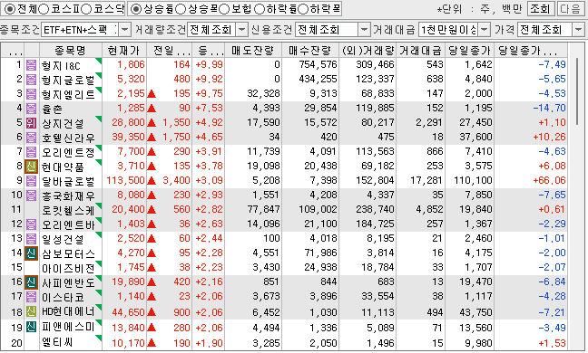 📈 형지I&C(+9.99%) / 형지글로벌(+9.92%) / 형지엘리트(+9.75%) / 상지건설(+4.92%) / 오리엔트정공(+3.91%) / 오리엔트바이오(+2.63%) / 일성건설(+2.44%) / 이스타코(+2.06%) / 넥스트아이(+1.45%)