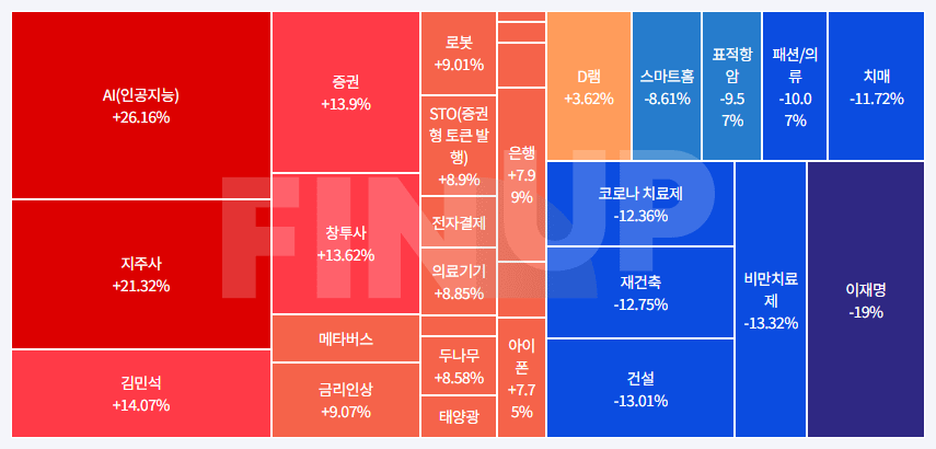 금융주 강세: 증권업종 +8.14%, 보험 +8.03%, 부국증권 +22.67%, 미래에셋증권 +13.25%, KB금융 +7.90%